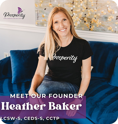 Heather Baker has been the founder and CEO of Prosperity since 2012. She is a Certified Eating Disorder Specialist, Supervisor, and EMDR practitioner, who has been passionate and driven to help clients heal from their eating disorders for over 20 years. As the founder and sole owner of Prosperity in 2012, she ensures that everyone who comes to Prosperity receives the best possible care and believes they can fully recover. Heather opened a second location in Norfolk, Virginia, the first to bring eating disorder care to the Tidewater region. In 2012 and 2014, Heather trained under Pia Melody in the PIT Model for trauma with a specialty in inner-child work and has also completed advanced training under Daniel Merlis, LCSW, and Amanda Roberts, PhD, in EMDR.